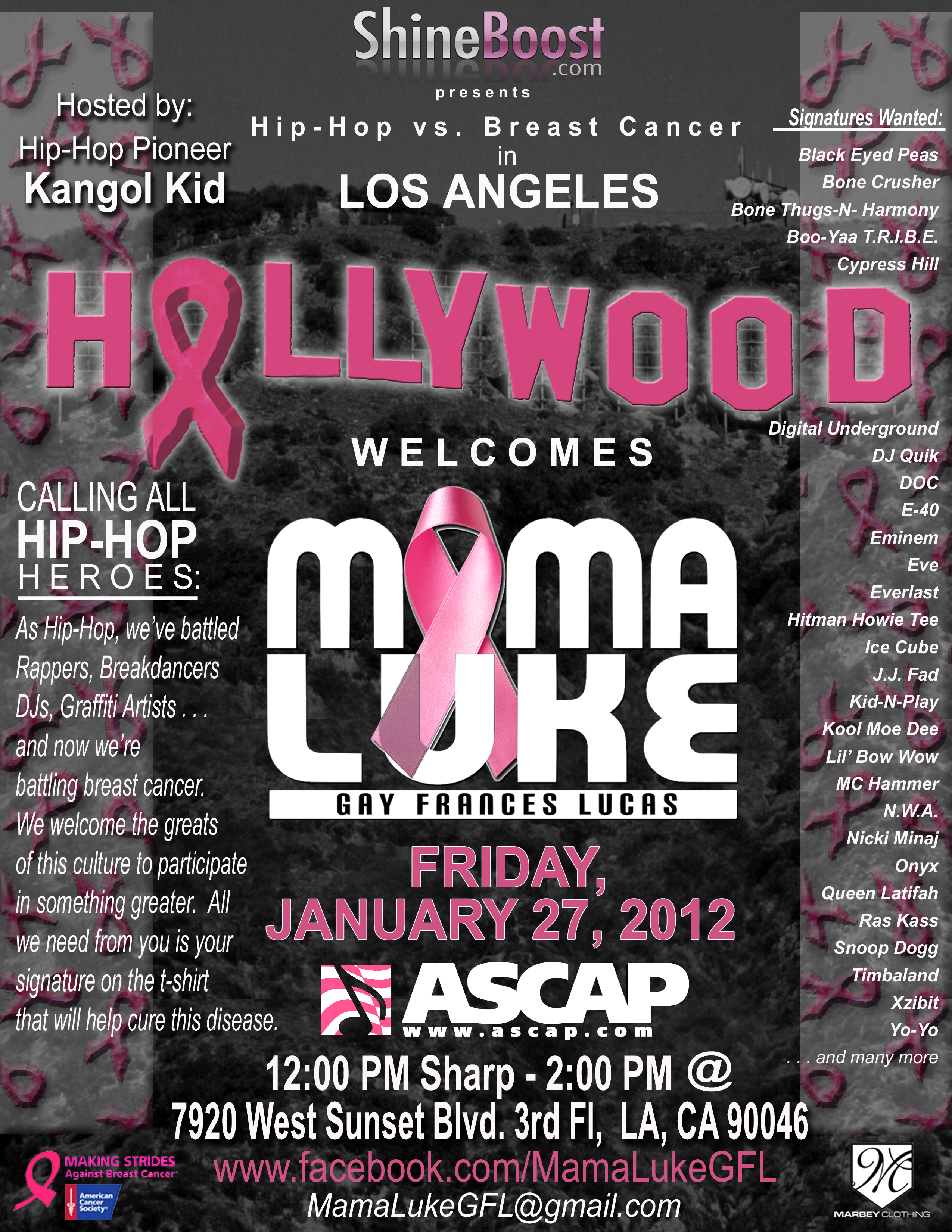 On January 27th 2012, the West Coast Fight Against Breast Cancer will be held at My House in Hollywood starting at 7pm. This red-carpet evening event will consist of live entertainment, showcases, and special appearances. This event will be centered around Kangol Kid’s Mama Luke Movement, which is a catalyst for the fight against breast cancer.